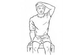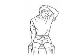 - Con una mano agarrada al asiento inclinar lateralmente del cuello hacia el otro lado con ayuda de la otra mano. Mantener 15-30 segundos y volver a la posición inicial. Repetir 3 veces.